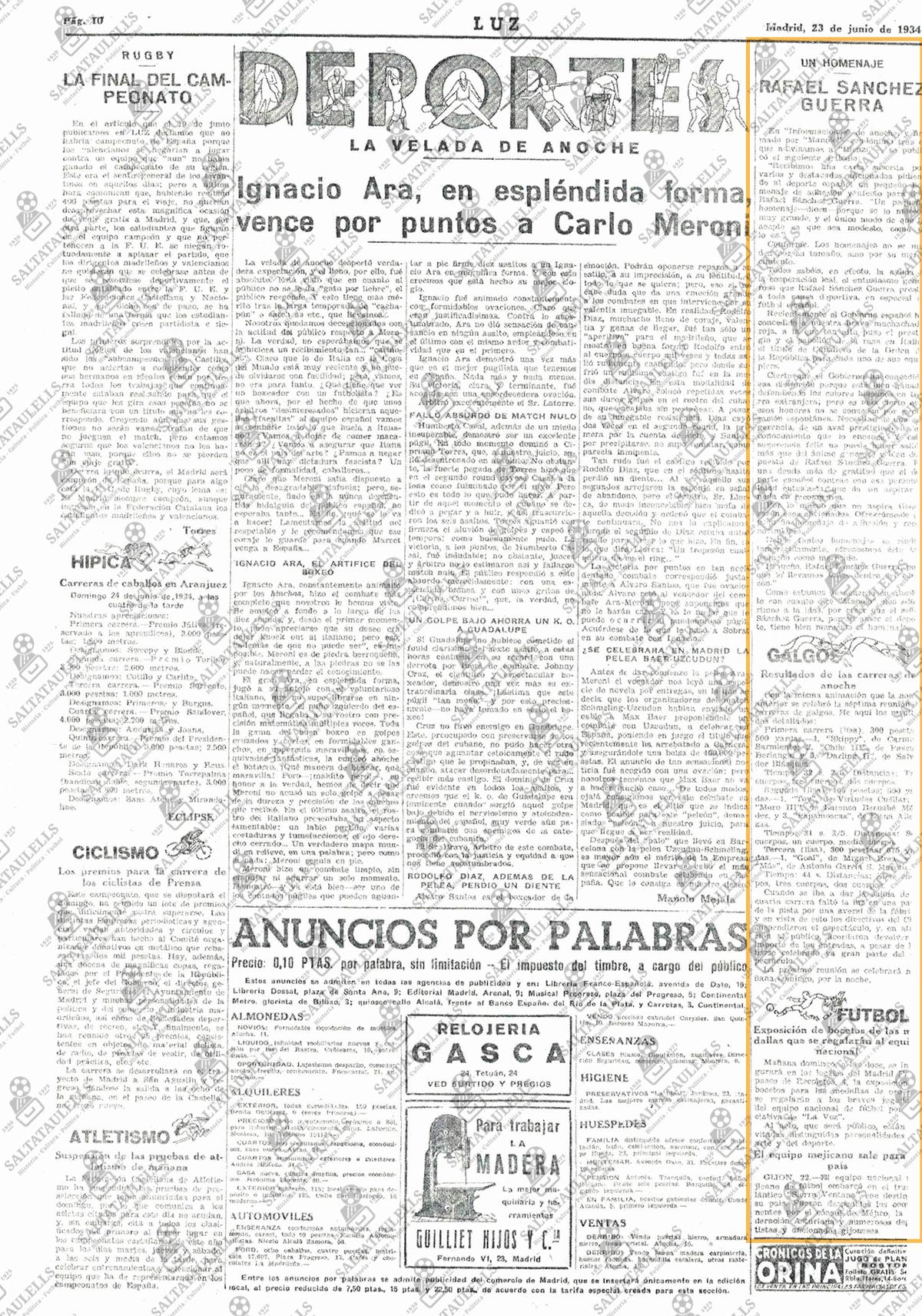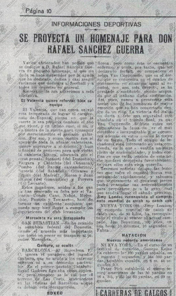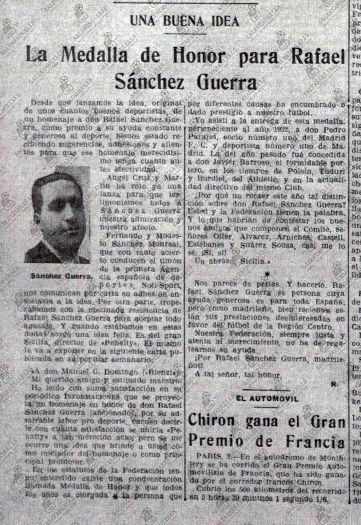 “Recibimos una carta suscrita por varios y destacados aficionados pidiendo al deporte español un pequeño homenaje de adhesión y afecto para don Rafael Sánchez-Guerra. “Un pequeño homenaje-dicen-porque se lo merece muy grande, y el único modo de que lo acepte es que sea modesto, como él lo es “.