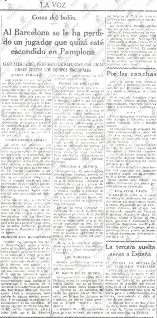 Barcelona 26.-El F.C. Barcelona ignora el paralelo de su jugador Seve Goiburu, que no acude a los entrenamientos ni a su domicilio particular en esta. En el primer “match” Cataluña-Brasil, Goiburu figuraba como suplente; pero no acudió a Las Corts, y en ningún sitio dan razón del popular delantero.