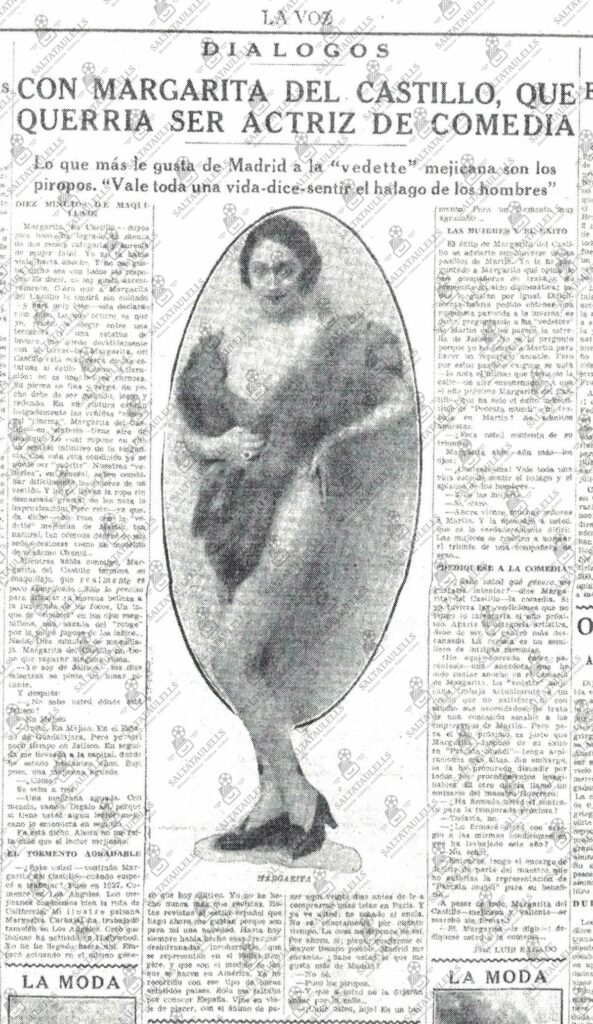Algún día antes, el 22/6/1934, tambien La Voz se hace una entrevista a la actriz mejicana, casi en cueros, Margarita del Castillo, que ha venido a Madrid y que dicho trabajo tiene como bajo título:
