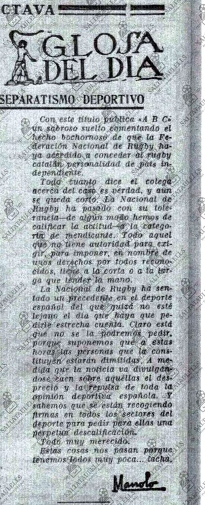 Es el periodista que en marzo 1939 publica en Marca, el célebre “Y le querían llamar España” y que los “saltataulells” siempre culpan a Madrid, cuando el rumor esta solo en Barcelona y es local.