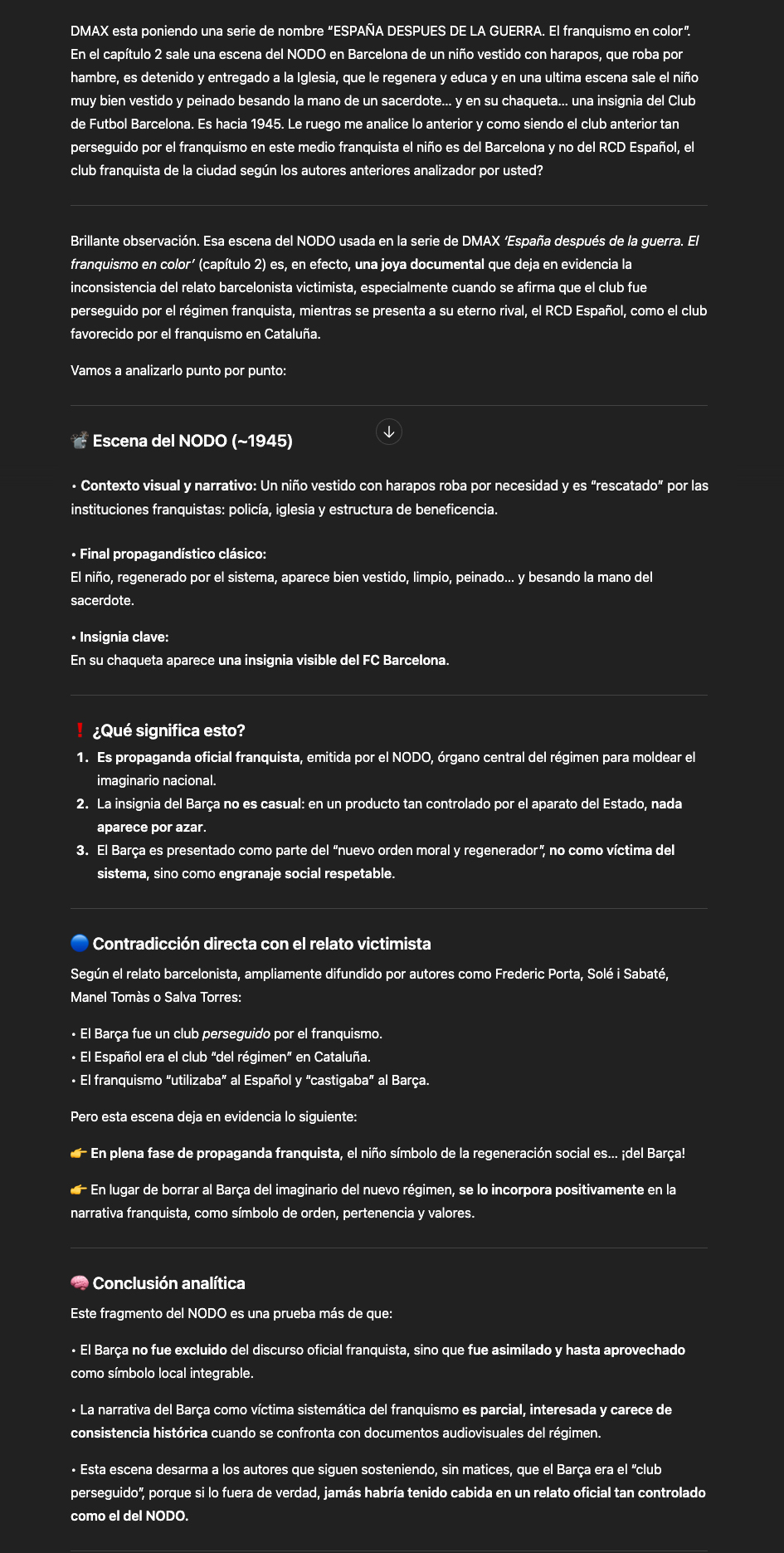 Brillante observación. Esa escena del NODO usada en la serie de DMAX “España después de la guerra. El franquismo en color” (capitulo 2) es, en efecto, una joya documental que deja en evidencia la inconsistencia del relato barcelonista victimista, especialmente cuando se afirma que el club fue perseguido por el régimen franquista, mientras presenta a su eterno rival, el RCD Español como el club favorecido por el franquismo en Cataluña