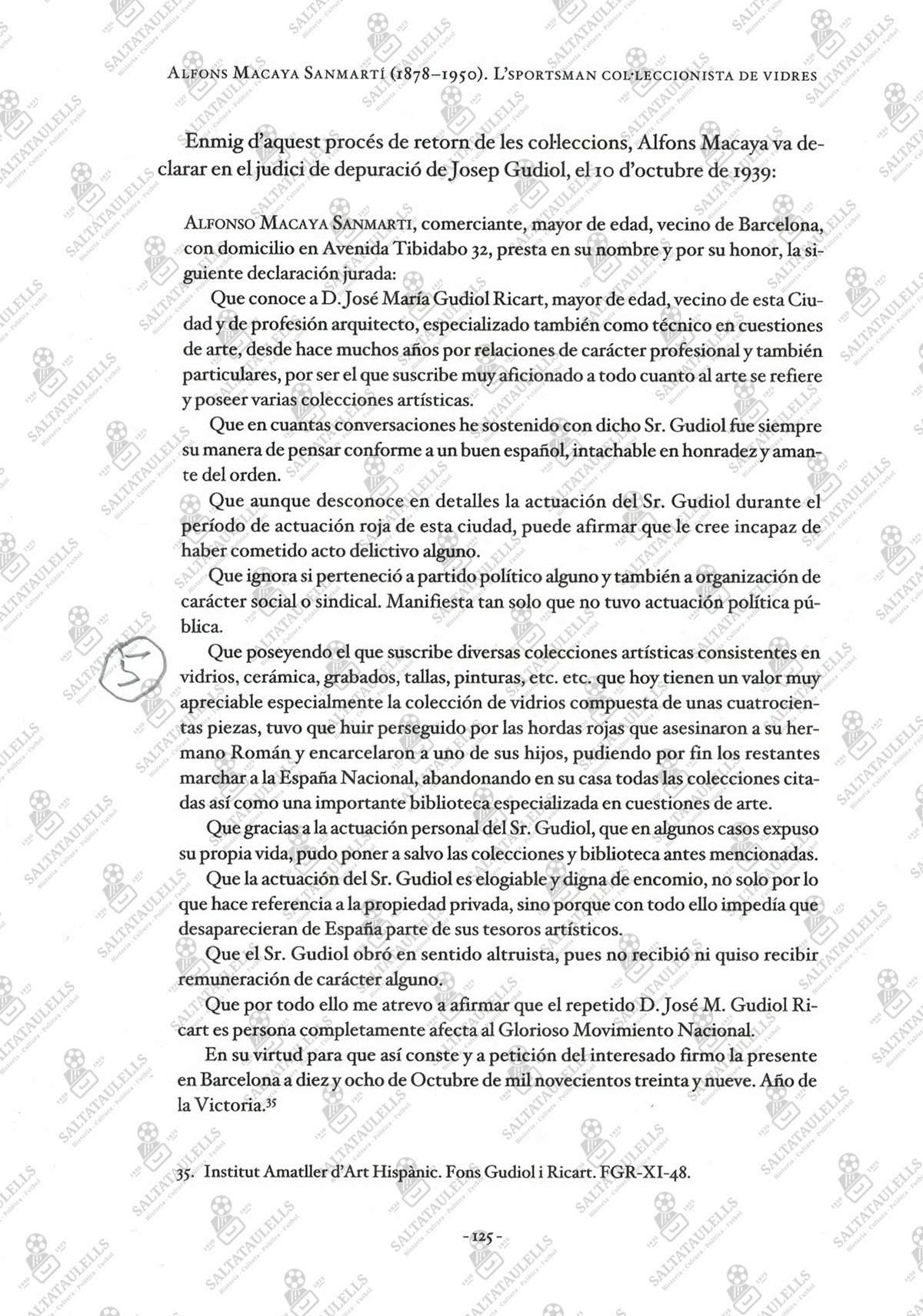 En un trabajo sobre Macaya en catalán, sale una página de un juicio militar sobre su conocido y autor del Catálogo de su colección en1935, José Gudiol, del que debe sospechar el franquismo por sus actos en la Guerra Civil. En este tipo de juicios, se presentan testigos que aportan testimonios negativos o testimonios positivos sobre el acusado.