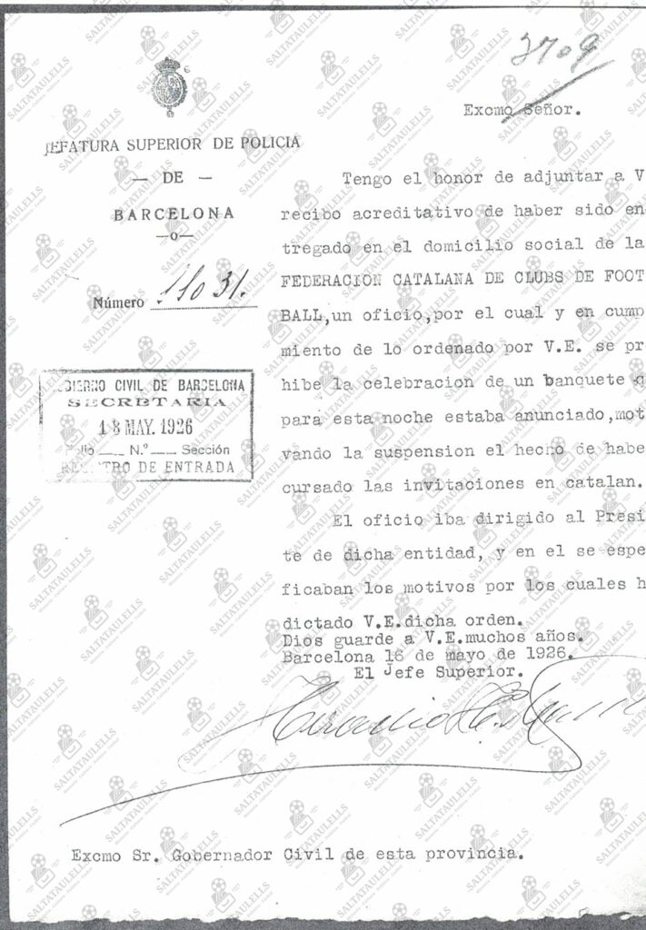 Del expediente donde todo el mundo toma datos existe el documento de arriba, que anuncia la prohibición de un homenaje a la Federación Catalana de Clubs de Foot-Ball, que no al FC Barcelona, como dice el “saltataulells”.